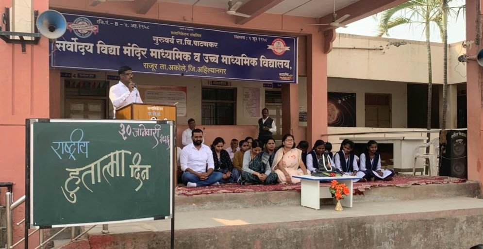 याप्रसंगी आयोजित कार्यक्रमामध्ये विद्यालयाचे प्राचार्य श्री.भाऊसाहेब बनकर, उपप्राचार्य श्री.दिपक बुऱ्हाडे, ज्येष्ठ शिक्षिका श्रीमती बीना सावंत, वसतिगृह अधीक्षिका श्रीमती श्रद्धा जोशी तसेच उच्च माध्यमिक विभागातील सर्व शिक्षक-शिक्षकेतर कर्मचारी व इयत्ता ११ वी चे विद्यार्थी मोठ्या संख्येने उपस्थित होते. उपप्राचार्य श्री.दिपक बुऱ्हाडे यांनी या कार्यक्रमाची रूपरेषा विषद केली. मराठी विषय-शिक्षक श्री.संतराम बारवकर यांनी राष्ट्रीय हुतात्मा दिनाचे महत्व व त्याचबरोबर गांधीजींच्या महान कार्याचा उल्लेख केला. सावित्रीबाई मदन कन्या निवासच्या मुलींनी सुश्राव्य अशा सर्वधर्मीय प्रार्थनेचे गायन केले.