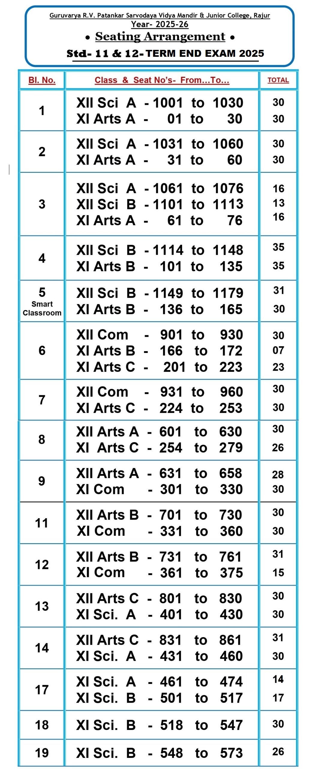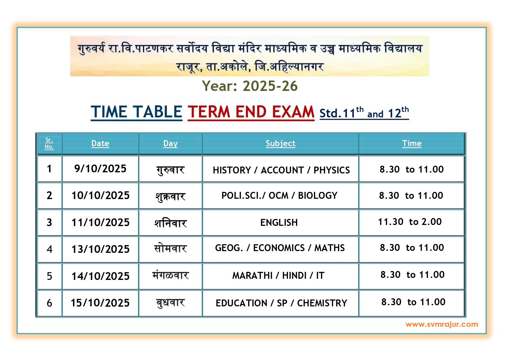 • इयत्ता ११ वी व १२ वी ची प्रथम सत्र परीक्षा ही ९/१०/२०२५ ते १५/१०/२०२५ या कालावधीत होत आहे.