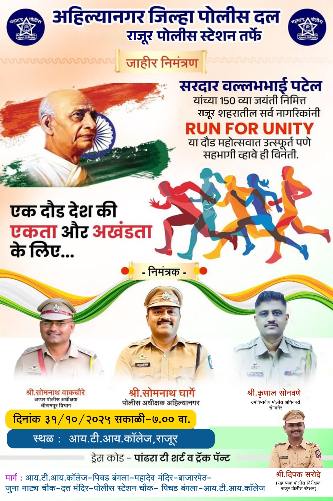 अहिल्यानगर जिल्हा पोलीस दल, राजूर पोलीस स्टेशन, गुरुवर्य रा.वि.पाटणकर सर्वोदय विद्या मंदिर माध्यमिक व उच्च माध्यमिक विद्यालय NCC विभाग, औद्योगिक प्रशिक्षण संस्था, राजूर व सत्वशील करिअर अकॅडमी, राजूर यांचे संयुक्त विद्यमाने आज सरदार वल्लभभाई पटेल यांच्या १५० व्या जयंतीनिमित्त राजुरमध्ये एकता दौड (Run For Unity) आयोजित करण्यात आली. आय.टी.आय. कॉलेज पासून निघालेल्या या एकता दौडमध्ये विद्यार्थी, शिक्षक, पोलीस कर्मचारी व ग्रामस्थ या सर्वांनी उत्स्फुर्तपणे सहभाग घेऊन ख-या अर्थाने एकता व एकात्मतेचे दर्शन घडविले. संपूर्ण राजूर शहरातून निघालेल्या या दौडमधून राजूरकरांना एकता व एकात्मतेचा संदेश देण्यात आला.