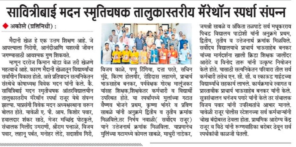सत्यनिकेतन संस्था आयोजित ‘कै.सावित्रीबाई मदन स्मृतीचषक आंतरविद्यालयीन तालुकास्तरीय मॅरेथॉन स्पर्धा’ अतिशय खेळीमेळीच्या वातावरणात पार पडल्या.