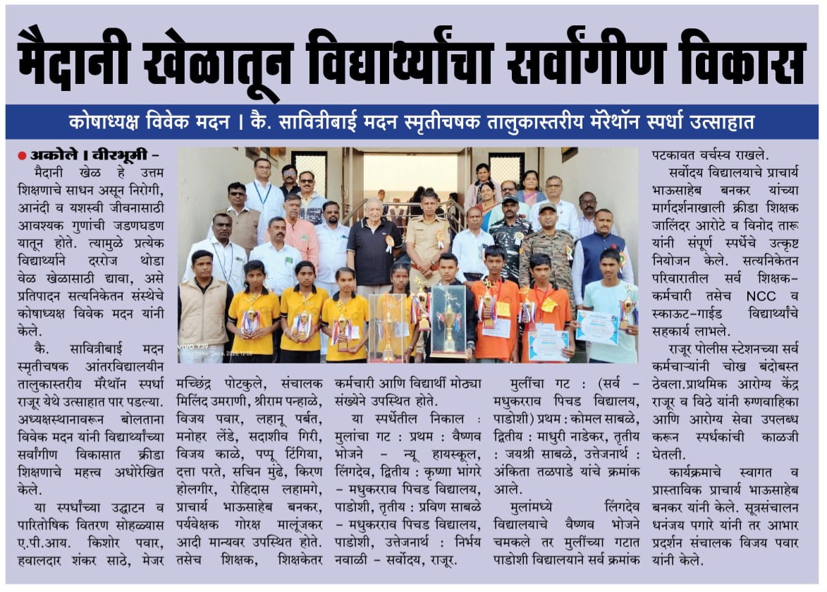 सत्यनिकेतन संस्था आयोजित ‘कै.सावित्रीबाई मदन स्मृतीचषक आंतरविद्यालयीन तालुकास्तरीय मॅरेथॉन स्पर्धा’ अतिशय खेळीमेळीच्या वातावरणात पार पडल्या.