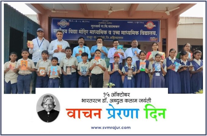 ‘गुरुवर्य रा.वि.पाटणकर सर्वोदय विद्या मंदिर माध्यमिक व उच्च माध्यमिक विद्यालय, राजूर’ येथे आज १५ ऑक्टोबर हा दिवस ‘वाचन प्रेरणा दिन‘ म्हणून साजरा केला गेला. याप्रसंगी विद्यालयातील विद्यार्थ्यांना विद्यालयाच्या प्रांगणात एकत्र करून त्यांना वाचनासाठी पुस्तके देण्यात आली. अतिशय प्रसन्न अशा वातावरणात विद्यार्थी अक्षरशः वाचनामध्ये दंग झाले होते. वेगवेगळ्या लेखकांची वेगवेगळी पुस्तके वाचण्याचा आनंद विद्यार्थ्यांनी लुटला. यावेळी विद्यार्थ्यांमध्ये वाचनाबद्दलची उत्सुकता व आवड दिसून आली.