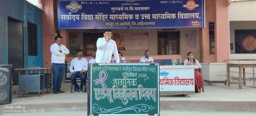 गुरुवर्य रा.वि.पाटणकर सर्वोदय विद्या मंदिर माध्यमिक व उच्च माध्यमिक विद्यालयामध्ये १ डिसेंबर रोजी जागतिक एड्स दिनानिमित्त जनजागृती कार्यक्रमाचे आयोजन करण्यात आले. ज्येष्ठ विज्ञान-विषय शिक्षक श्री. किशोर देशमुख यांनी विद्यार्थ्यांना एड्सविषयक मुलभूत माहिती, प्रतिबंधक उपाययोजना आणि जागरूकता याबाबत मार्गदर्शन केले. ज्येष्ठ शिक्षिका श्रीमती सानप मॅडम यांनी एड्स दिनाचे उद्दिष्ट, सुरक्षित व जबाबदार वर्तनाचे महत्त्व तसेच समाजातील गैरसमज दूर करण्यासाठी घेतल्या जाणाऱ्या उपायांची माहिती विद्यार्थ्यांना दिली. या सत्रामुळे विद्यार्थ्यांना आरोग्याविषयक सजगता, संवेदनशीलता आणि संबंधांबाबत काळजीपूर्वक व जबाबदार दृष्टीकोन याबाबत मार्गदर्शन करण्यात आले.